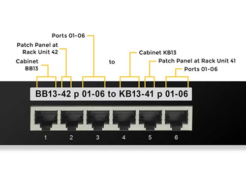 Rotulagem padrão TIA-606: armários, patch panels, portas, tomadas, fibras e DIOs.